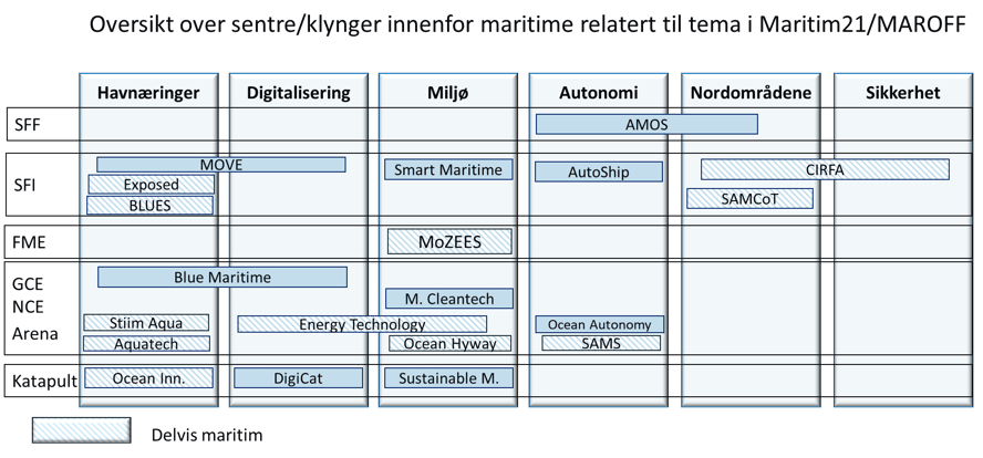 Samtidig ble det også laget en oversikt over ulike maritime sentre; Senter for Fremdragende Forskning (SFF), Senter for Forskingsdrevet Innovasjon (SFI), Forskningssentre fro Miljøvennlig Energi (FME), Global Centres of Expertise (GCE), Norwegian Centres of Expertise (NCE), Arena og Katapult. Også her er del nøkkelopplysninger registrert for hvert senter i tillegg til en kort omtale og lenke til nettsted. Her finner du en oversikt over ulike ressurser.